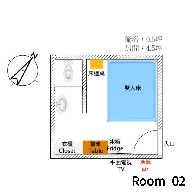 | RentRent | ●Room 302.402.502 (The size and design are all the same.) NTD 14,500 / month 【Short-term contract】 ・For 3~5 month NTD 14,500/month + NTD 3,000/month ・For 6~11 month NTD 14,500/month + NTD 1,500/month ●Room 202 (The size and design are the same as 302, 402, and 502, but there is no natural light) NTD 13,500/month 【Short-term contract】 ・For 3~5 month NTD 14,500/month + NTD 3,000/month ・For 6~11 month NTD 14,500/month + NTD 1,500/month |